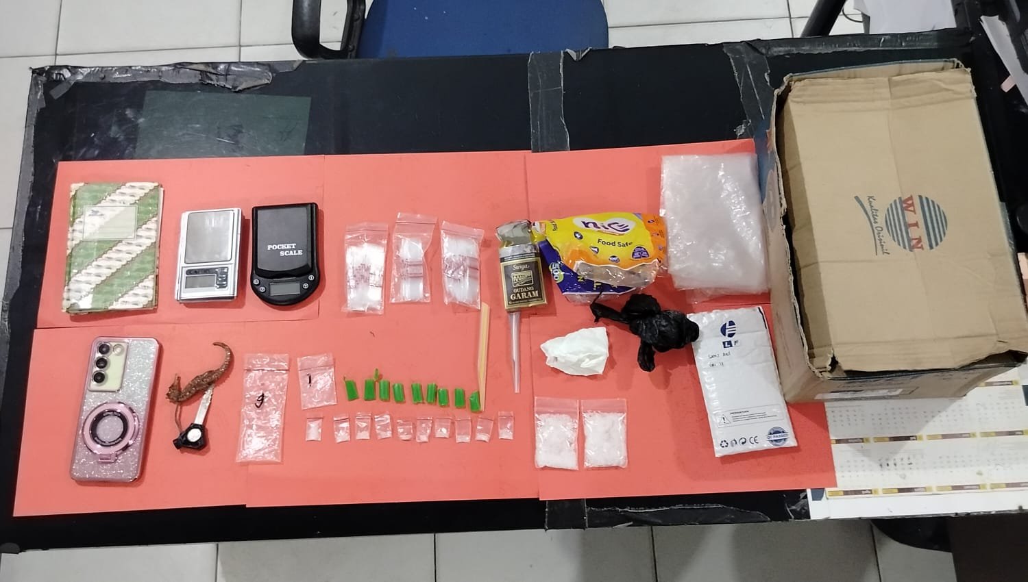 Dalam penggeledahan yang disaksikan aparatur desa, petugas menemukan satu paket besar, lima paket sedang, dan 27 paket kecil diduga sabu, serta alat hisap, timbangan digital, dan perlengkapan lainnya.Dari hasil pemeriksaan awal, pelaku mengakui barang tersebut merupakan miliknya yang diperoleh dari seseorang berinisial BR, yang saat ini masih dalam proses pengembangan oleh pihak kepolisian.